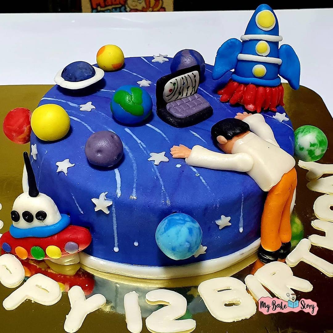 A delightful tart with chocolate. Adorned with fondant and ganache. Crafted with eggless ingredients. This cake was about a boy’s dreams..the cake was designed as per her mother’s description…the boy