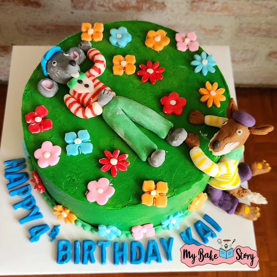 A delightful cake. Perfect for birthday celebrations. This cake was inspired by a Norwegian story book called ” Hakkebakkeskogen” as mentioned by the birthday boys mom. And the lil one
