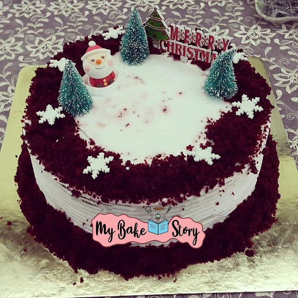 A delightful red velvet cake. Beautifully decorated with whipped cream. Perfect for Christmas celebrations. Crafted with eggless ingredients. — #mybakestory #Christmasapecial #Eggless #redvelvetcake #Whippedcream #Frosting