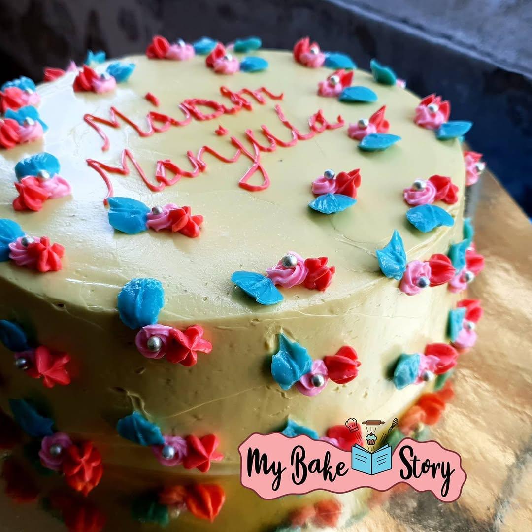 A delightful cake with chocolate. Adorned with buttercream and floral decorations. Perfect for birthday celebrations. Crafted with eggless ingredients. — #mybakestory #egglessbaking #egglessbaker #buttercream #buttercreamfrosting #chocolatecake #buttercreamflowers #birthdaycake